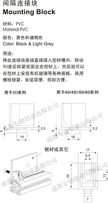 將此連接塊尾端直接插入型材槽內(nèi),轉(zhuǎn)動(dòng)90度后即緊密固定在型材上,然后就可以在型材上安裝有機(jī)玻璃等各種面板,再用螺栓鎖緊,安裝簡(jiǎn)便,拆卸方便。